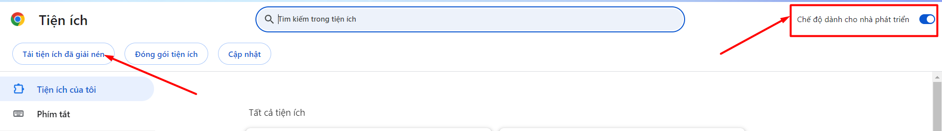 Bước 6: Nếu chưa bật chế độ nhà phát triển thì hãy bật chế độ này lên ở góc trên bên phải. Sau đó chọn “Tải tiện ích đã giải nén”